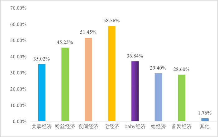 新生代成长的环境伴随移动互联的兴起,其生活习惯和消费习惯都有其专属标签,他们消费力强,能赚敢花为其显著特点。未来5年,上海青年认为最看好的消费新时尚是“到家服务、生鲜电商、餐饮外卖等宅经济”(58.73%)。其次,“晚间购物、餐饮、旅游等夜间经济”(51.45%)、“网红、明星直播带货等粉丝经济”(45.25%)也是上海青年期待追求的生活新时尚。