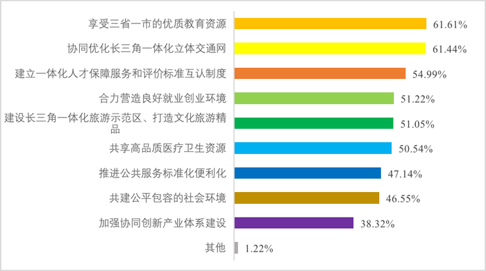对于长三角一体化发展,互通共享的红利效应是青年的“美好愿景”。调研发现,“享受三省一市的优质教育资源”占比61.61%,“协同优化长三角一体化立体交通网”占比61.44%。其次,建立一体化人才保障服务和评价标准互认制度,建设长三角一体化旅游示范区、打造文化旅游精品,合力营造良好就业创业环境,也是青年呼声较高的期待。