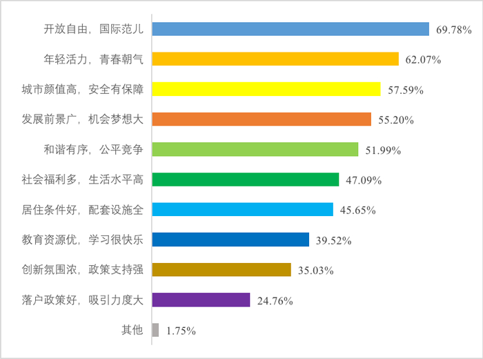此外,针对未来上海最具魅力的方面,青年认为从高到底依次是“开放自由,国际范儿”(69.78%)、“年轻活力,青春朝气”(62.07%)、“城市颜值高,安全有保障”(57.59%)、“发展前景广,机会梦想大”(55.20%)。可见,安全感、国际范、开放有魅力、青春有活力和未来有机会是魔都吸引青年的重要因素。