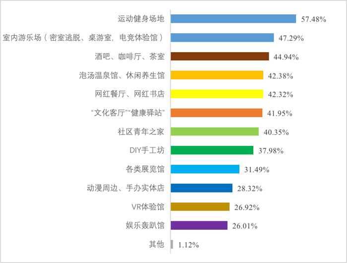 未来五年,青年最希望拓展的活动空间排名前五的分别是:运动健身场地(57.48%)、室内游乐场(密室逃脱、桌游室、电竞体验馆)(47.29%)、酒吧、咖啡厅、茶室(44.94%)、泡汤温泉馆、休闲养生馆(42.38%)、网红餐厅、网红书店(42.32%)。这既反映了青年对“亚健康”状态下对健身休闲的高需求,又体现上海青年对品质生活的卓越追求。