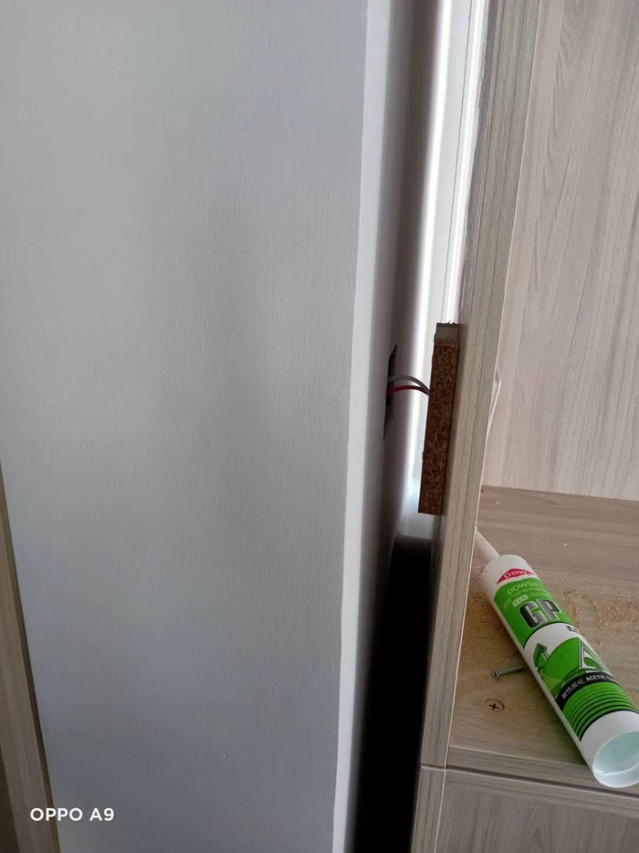 电源插座被封在衣柜里,故在衣柜上开孔,但中间连接电线无保护措施