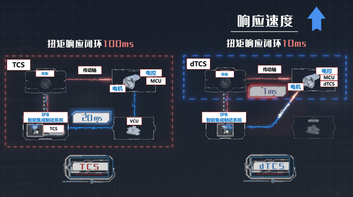 dTCS(distributedTCS)是专门为新能源汽车打造的驱动力控制系统,传统的TCS将控制放在ESP车身电子稳定系统或IPB智能集成制动系统中,通过与动力系统的信号交互进行扭矩控制,dTCS将牵引力控制系统上移至电机控制器中带来更快速的电机扭矩响应,此时电机控制器直接判断,控制轮胎打滑。