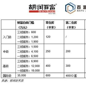 胡润研究院指出,中国三线城市入门级财富自由门槛是600万元,主要包括一套120平米的市区常住房、2辆车、20万元的家庭税后年收入和250万元的金融投资;中级财富自由门槛是1500万元,主要包括一套250平米的市区常住房、一套200平米的郊区第二住房、2辆车、50万元的家庭税后年收入和400万元的金融投资;高级财富自由门槛是6900万元,主要包括一套400平米的市区常住房、一套300平米的郊区第二住房、4辆车、250万元的家庭税后年收入和2500万元的金融投资。