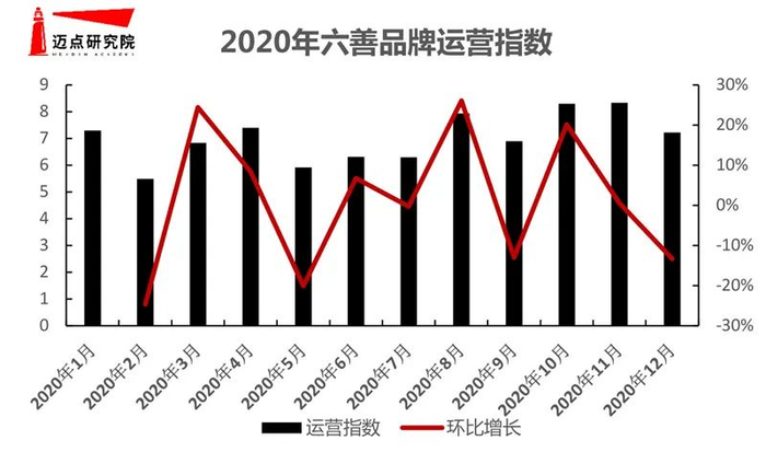 2020年,六善在监测范围时间内平均运营指数为7.02,运营指数整体保持平稳上升状态。集团所属微博粉丝数为144550,微博累计发布量3311条,搜狗微信文章发布量为1289条,主要包括盲盒抽奖、住宿体验打造、设计风格、品牌折扣等。