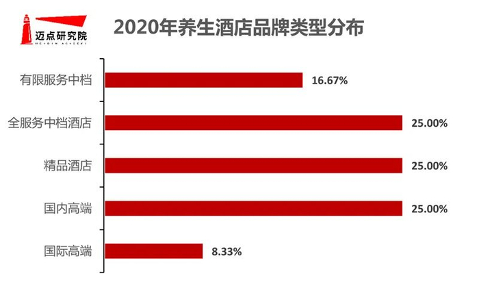 近几年,消费客群在进行旅游住宿外,更倾向于获得身体及精神上的健康及放松。受2020年新冠肺炎疫情影响,疫情对大健康概念的带动,助力康养旅游占比进一步扩大,养生酒店发展呈现快速发展态势,成为酒店主题细分第十一大类型。根据迈点研究院监测数据:养生酒店在酒店细分市场中占比3.99%,次于商务酒店、度假酒店、生活方式酒店、文化主题酒店、个性化酒店、电竞酒店、艺术酒店、设计师酒店、电影酒店、社交酒店类型,这十个主题在细分市场占比分别为17.09%、14.53%、12.83%、10.83%、7.98%、5.13%、4.84%、4.56%、4.27%。