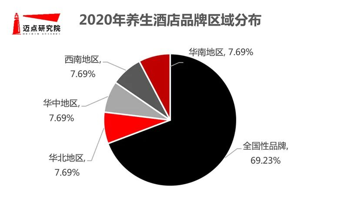 品牌地域来看,养生酒店品牌主要为全国性品牌拓展推进,占比为69.23%,如阿纳迪、都喜天丽、雅致、六善等。其次为华中、华北、西南、华南地区,占比均为为7.69%。品牌在这些区域选址多集中在温泉、生态、滨海、山体自然资源优越的地方,营造度假与康养结合的要素体系,并融合医疗、健康管理、康复理疗、休闲疗养及养老等元素,形成旅游住宿产品,如青城山六善酒店善,坐落于道教文化地青城山,邻近都江堰,风景秀丽。