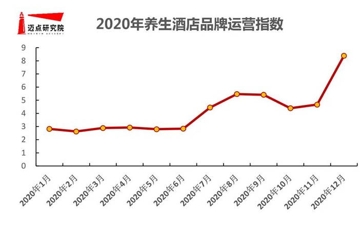 疫情中人们更加重视健康的消费心理得以强化,因此从2020年养生酒店品牌指数来看,整体呈现稳步提升提升态势,并在4季度触峰,12月达到高位。运营指数大致呈现类似态势,但波动更为强烈,1、2季度平稳提升,3季度迎来小型峰值,并在12月最终达到最高,反映出养生酒店品牌主题酒店在线上运营、线下推广的品牌运营发展趋势。