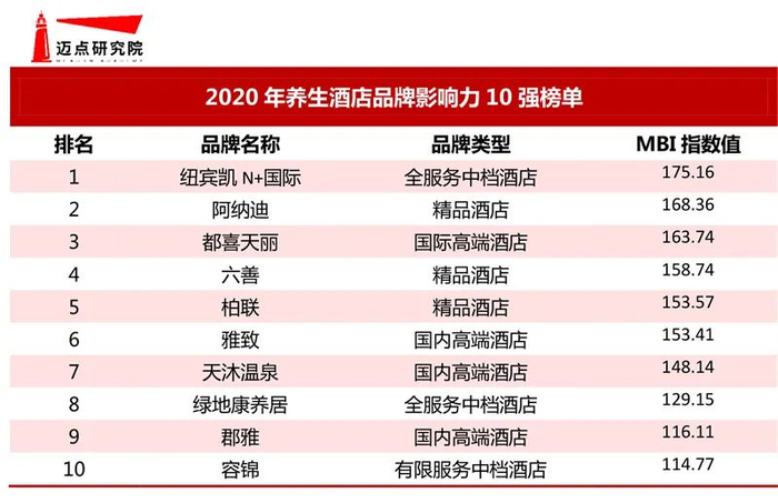 迈点研究院独家发布“2020年养生酒店品牌影响力10强榜单”,榜单显示,纽宾凯N+国际、阿纳迪、都喜天丽位列榜单前三,六善、柏联、雅致、天沐温泉、绿地康养居、郡雅、容锦进入前十。