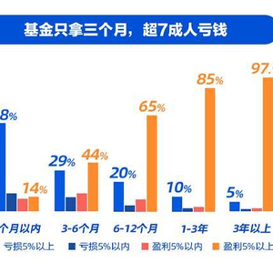 以支付宝金选近一百只产品为例,持有基金时长在3个月以内的用户,超7成都是亏损的,而持有基金时长超过一年的用户中,近9成是赚钱的。