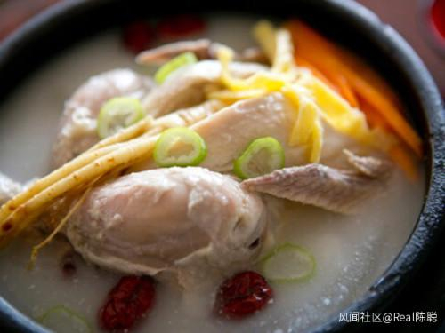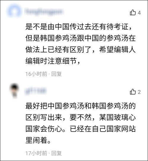 有网友称,韩国参鸡汤有别于广东的煲汤,两国的参鸡汤,虽然表面上看起来一样,但是做法却不同;中国,尤其是广东当地的参鸡汤基本上都是辅以人参直接煨煮,但韩国的做法,根据韩国农村振兴厅的说法,是添撒人参粉。