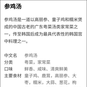 据悉,百度百科中“参鸡汤”词条对这道菜肴如此叙述到:“参鸡汤是一道以高丽参、童子鸡和糯米煲成的中国古老的广东粤菜汤类家常菜之一,传至韩国后成为最具代表性的韩国宫中料理之一。”