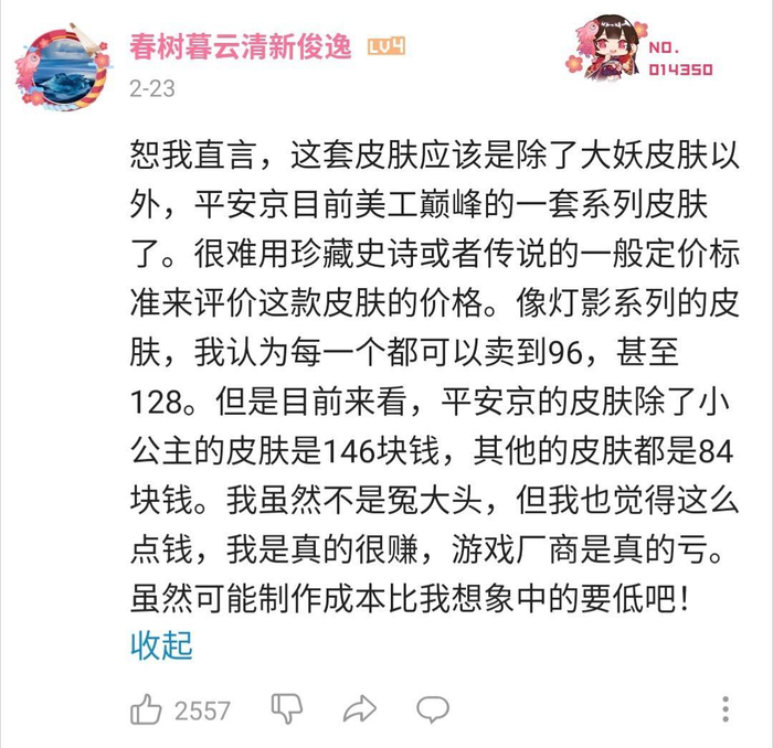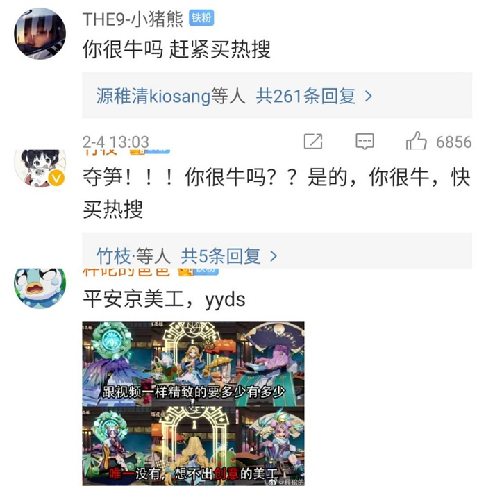 究其原因,并不是他们做得烂,在微博、B站等平台上,有大量的玩家都将《平安京》的美术称为“神仙美术”。但是因为定价不高,玩家又觉得他们在“用爱发电”。在微博上,玩家们甚至屡次要求他们多宣传宣传,“买几个热搜”。