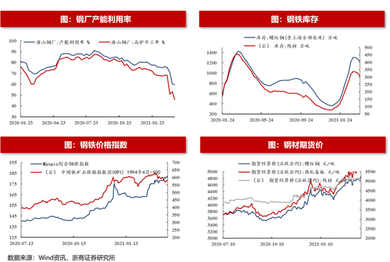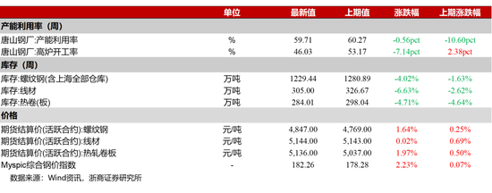 产能利用率:唐山钢厂产能利用率、高炉开工率分别降低0.56pct、降低7.14pct。