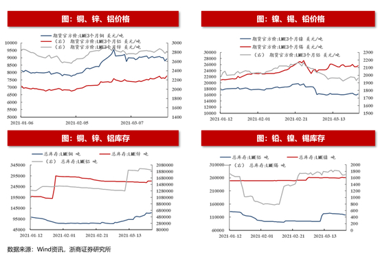 库存:铝、铅、锡库存减少,铜、锌、镍库存增加。