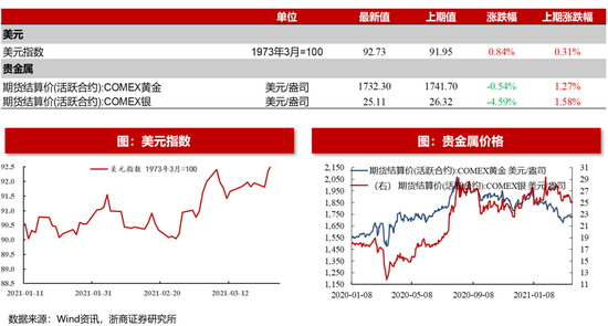 贵金属:黄金期货结算价下跌0.54%,至1732.30美元/盎司,银期货结算价下跌4.59%,至25.11美元/盎司。