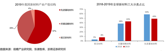 先进基础材料占比最大,前沿材料增速最快。根据前瞻产业研究院统计,2019年,我国新材料三大分类中,先进基础材料占比最大,达到57%,其次是关键战略材料(39%),前沿新材料(4%)。根据东滩智库的统计,2018-2019年全球新材料产业中,先进基础材料占比仍是最大,但前沿材料的占比增速最大,达到了158%,其次是关键战略材料(12%),而先进基础材料的占比下降了16%。