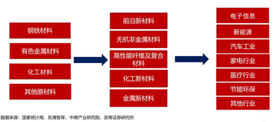 新材料,是指新出现的具有优异性能或特殊功能的材料,或是传统材料改进后性能明显提高或产生新功能的材料。新材料产业链包括上游钢铁材料、有色金属材料、化工材料等基础材料供应商,中游的前沿新材料、高性能纤维及复合材料等核心新材料制造商,以及下游电子信息、新能源等具体领域应用商。