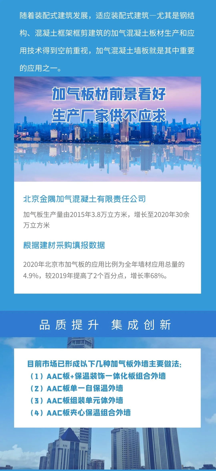 加气混凝土墙板的新型建造方式(装配式),其生产和应用可以减少混凝土等原材的使用。加气混凝土墙板生产工艺的成熟和装配式建筑的发展对提升北京市建筑行业整体墙体质量、促进节能减排以及实现“双碳”目标具有非常积极的作用,加气混凝土板材生产和应用技术也因此得到了空前的重视和发展。