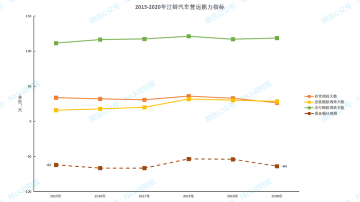 从营运能力来看,江铃汽车的付款期一直保持在120天左右,同时收款期和存货周转天数只有30天左右,因此现金循环周期常年保持在-60天左右,也就是说能够大量占用供应商的资金。