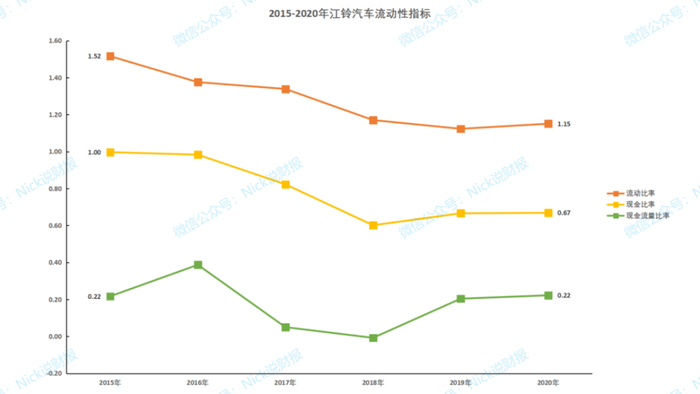 |强大的营运能力使得江铃汽车在近两年拥有稳定的经营性现金流,受此影响,企业的营运能力和资本结构长期保持健康态势,货币现金占流动资产的比率常年保持在50%以上