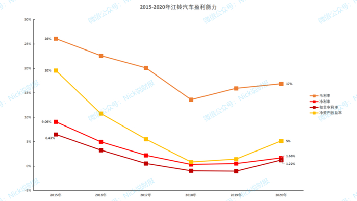 再来看盈利能力。江铃汽车2020年的毛利率达到了17%,在A股23家整车上市企业中位居第四,在商用车领域位居第一。结合前述的市场份额来看,江铃汽车是当之无愧的细分领域龙头。不过由于近些年市场竞争加剧,其毛利率水平显著下降。
