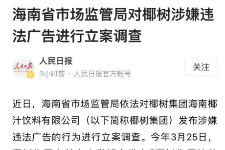 3月31日晚间,人民日报消息:海南省市场监管局依法对椰树集团发布涉嫌违法广告的行为进行立案调查。