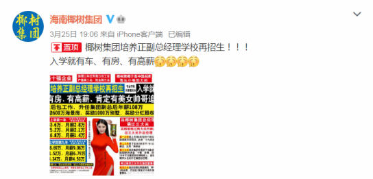 回溯事件,3月25日,椰树集团在其官方微博上发布“椰树集团培养正、副总经理学校再招生!!!专业不限只要懂写作,入学就有车、有房、有高薪、肯定有美女帅哥追”等内容的广告,引发社会争议。