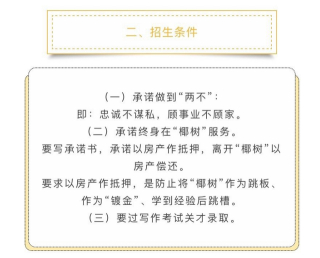 去年8月,椰树集团也曾为“职业经理学校”公开招生。其中,招收条件中提到,应征者需遵守两点承诺才能被录取,一要承诺做到“两不”:忠诚不谋私,顾事业不顾家;二要承诺终身在“椰树”服务,承诺以房产作抵押,离开“椰树”以房产偿还。