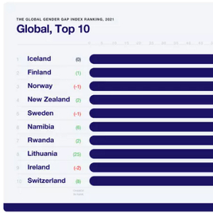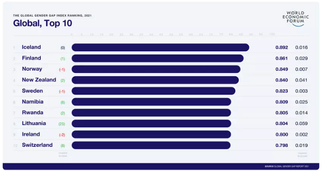 如前所述,在156个国家中,冰岛第十二次成为世界上性别最平等的国家。排名前十的国家还包括:冰岛、芬兰、挪威、新西兰、瑞典、纳米比亚、卢旺达、立陶宛、爱尔兰和瑞士。