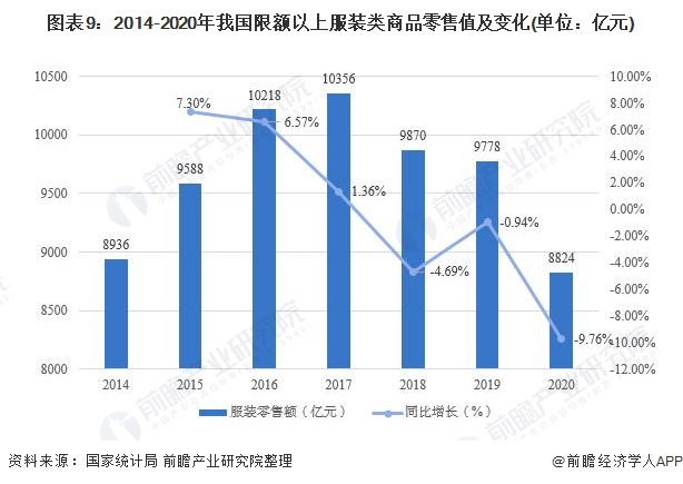 从我国限额以上服装类商品零售值来看,2014-2020年,我国服装零售额整体呈先增后减的趋势。2020年上半年,受疫情影响,服装业里生产需求减少,订单延迟或被取消的情况较多,进一步阻碍了我国服装业整体回暖,根据国家统计局数据,2020年我国限额以上服装类商品零售额为8824亿元,同比下降9.76%。对于,困境当下的服装企业,当务之急是做好内控,降低库存,做好中长期的持续发展规划。