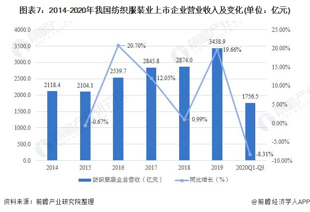 从我国纺织服装业上市企业的总体营收情况来看,在2014-2019年间得益于中国经济的稳定增长,居民的服装消费持续上升,促使中国服装纺织行业市场规模持续增长,2019年我国纺织服装业上市企业的总体营收规模为3438.9亿元,同比增长19.66%。