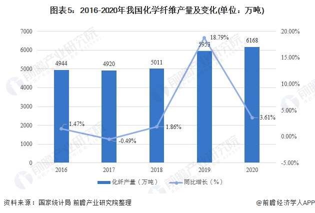 从化学纤维的供应来看,经过半个多世纪的发展,中国化学纤维市场目前形成了以内销为主、合成纤维为主流产品的市场格局。中国化学纤维行业发展态势良好,化学纤维产量在1998年后长期保持全球首位,2016-2020年我国化学纤维产量总体呈增长趋势,2020年我国共生产化学纤维6168万吨,同比增长3.61%。