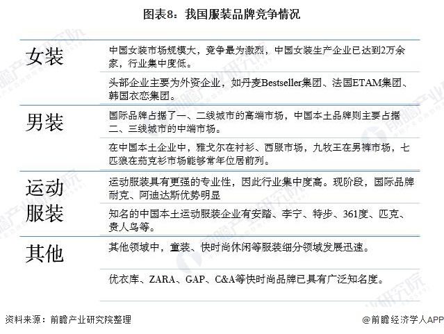 中国服装纺织行业产业链下游是服装品牌贸易商等服装管理及贸易企业,中国服装行业细分领域众多,包括男装、女装、运动服、休闲服等,导致中国服装企业众多,市场竞争激烈。然而,各服装细分领域的客户群体、客户消费习惯及市场发展阶段均有所不同,其市场竞争格局差异大,表现如下: