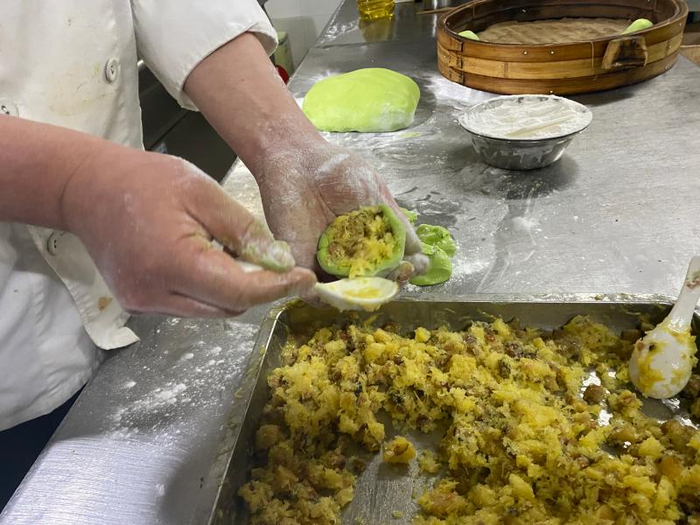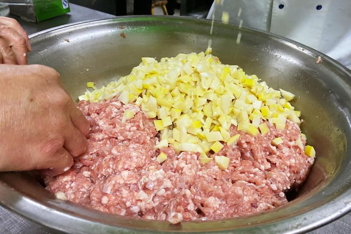 大师傅揭秘说,肉丁用的是肥瘦均匀的五花肉,口感比较丰富;用藕丁而不用笋丁,是因为藕经过冬天后,口味微微带甜,深得本帮菜“若要鲜,加点甜”的精髓;此外,馅料里还用了火腿末“吊鲜”。