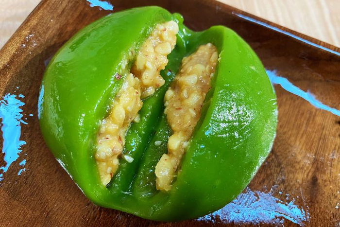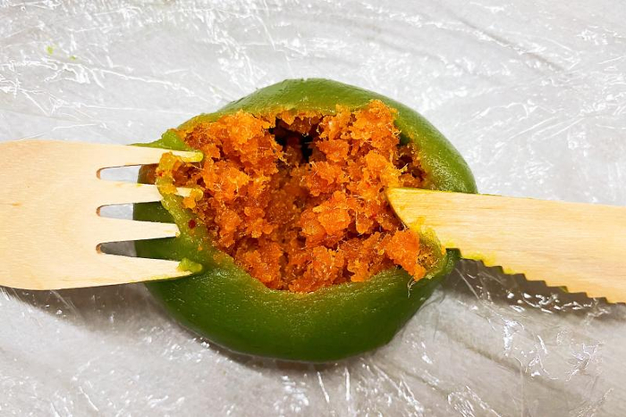 沈大成的两款青团都说主打“辣”,可总体来说都不算辣。原料用了高邮咸鸭蛋、印度魔鬼辣椒、老干妈等,把咸鲜口味提升到“有点刺激”的新高度。