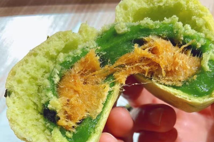 这款烤青团仅限乔家栅跨界门店“乔咖啡”有售,最外层是香脆的面包,中间是软糯的青团皮,内馅是咸蛋黄肉松。