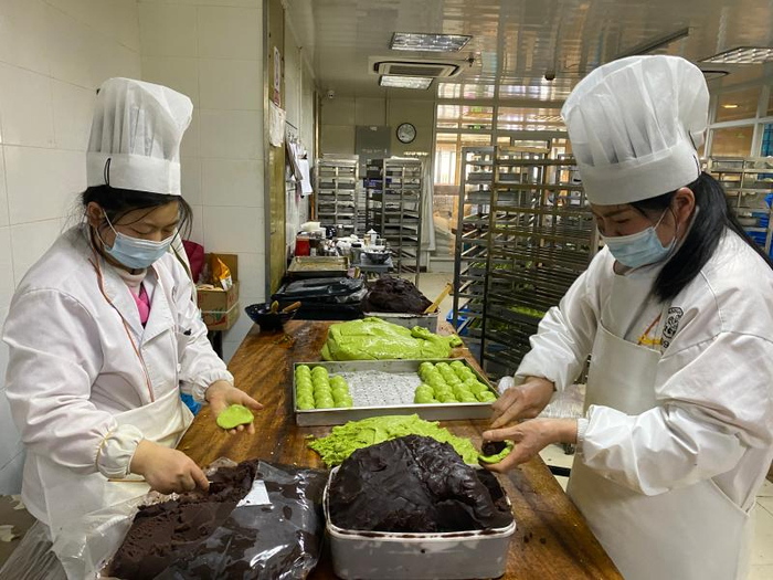 用大师傅的话来说,整个和面过程好比女性护肤——护肤水、肌底液、精华、润肤乳……每个环节都不能少,“糯米粉吃饱了水,就Q弹不紧绷了”。