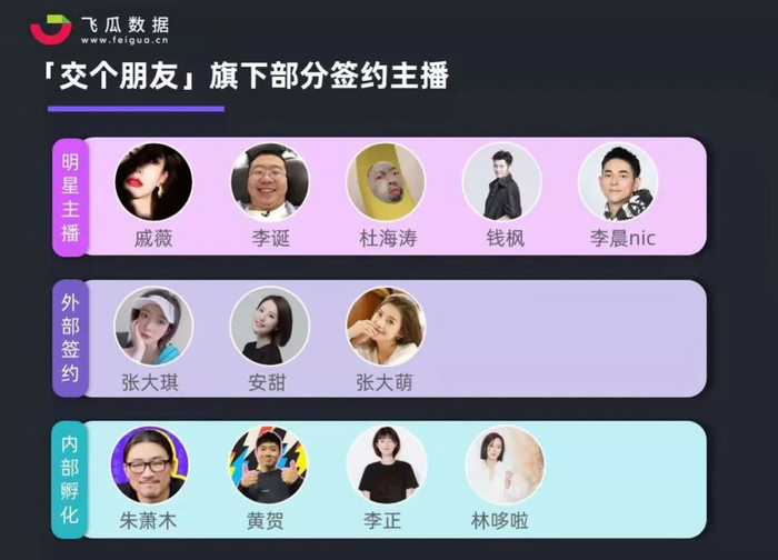 目前交个朋友旗下签约主播分为三大格局,以戚薇、李诞、杜海涛为代表的明星主播,和外部签约的张大琪、安甜等主播,以及内部孵化的朱萧木、黄贺、李正等主播,共签约20余人。交个朋友的MCN业务成为了,签约明星主播,孵化中腰部主播。同时,星野未来为主体的供应链业务,为罗永浩以及其他明星主播提供货源。