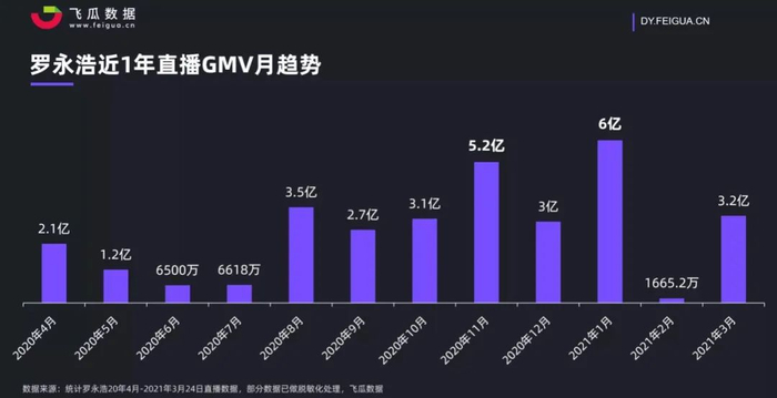 据飞瓜数据统计,截止到今年3月24日,罗永浩合作品牌超过1300家,抖音直播GMV破31亿。其中,21年1月的GMV达到6亿,是20年4月开播首月的3倍。而罗永浩的抖音粉丝量由首播前的100万人升至1666万人。