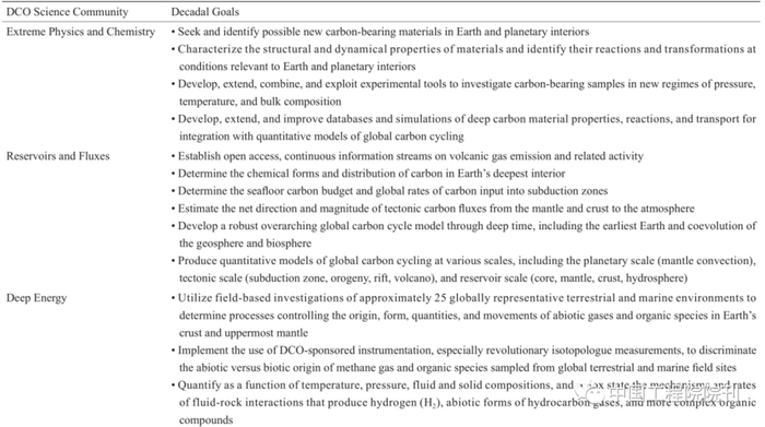 为了探究涉及多学科的科学问题,DCO联合了全球超过1200名科学家,把他们大致分为四个科学共同体:极端物理和化学、库藏与流量、深部能源和深部生命(表1)。该项目同时强调了四个能链接各团体的交叉活动——数据科学、仪器使用、野外工作以及建模和可视化,同时,几个跨领域的研究小组为整个DCO提供必要的支持与帮助(图1)。