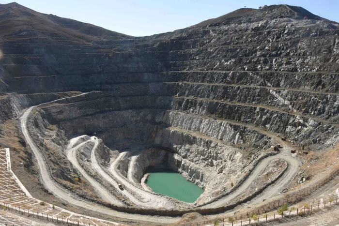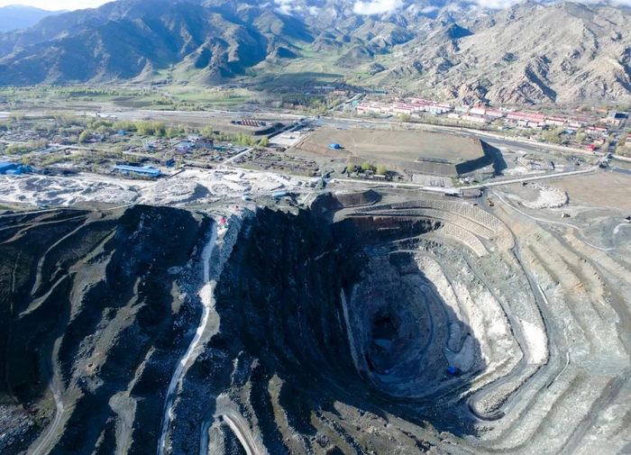 下方是一座纵深数百米的巨型矿坑,沿着坑体边缘环绕着一圈又一圈石子路,沿路又零星分布着一眼眼矿洞,在其中几个矿洞洞口,还有工人施工留下的工具和器械。或许是矿坑已深及储水层,坑底淤积着一汪幽蓝的水,像只明亮的眸子。