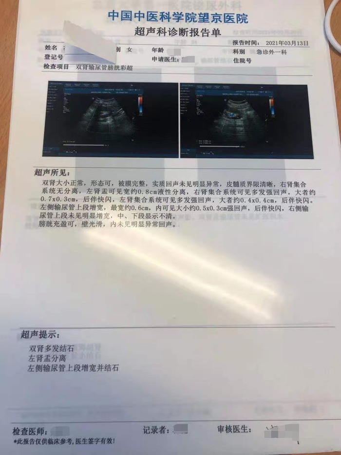 但陈洁3月13日的彩照诊断报告单却显示“右肾集合系统可见多发强回声,大者约0.7×0.3cm,左肾集合系统可见多发强回声,大者约0.4cm×0.4cm”,超声结果提示,她“双肾多发结石,左肾盂分离,左侧输尿管上段增宽并结石”。