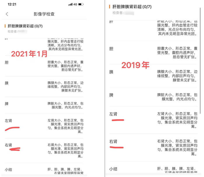 陈洁在2019年、2021年两次体检中腹部彩超均显示双肾正常。本文图片均为受访者供图