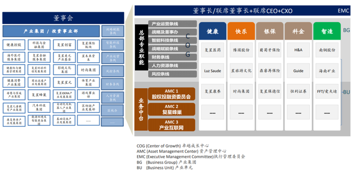 另外,值得重点提及的是,复星为了更好地利用互联网思维深度运营客户,创造新的价值增长点,还在集团层面新设产业互联网事业群,各个BG/AMC和BU也分别设立专门的产业互联网部门以实现与互联网的融合。