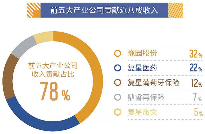 首先,从数据上看,复星国际2020年全年实现整体营收人民币1366亿元,归属母公司股东的净利润80.2亿元。其中,复星产业运营利润高达81.5亿元,医药、豫园股份、复星旅文、葡萄牙保险和鼎睿再保险前五大产业公司累计贡献了复星近8成的收入,这充分证明了复星作为一家“产业集团”的企业本质。
