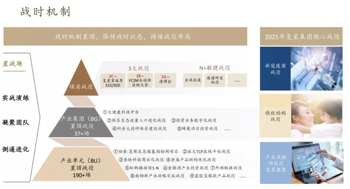 以“战役”机制为例,其形成源于复星2020年抗击新冠疫情行动中形成的“战时状态”和战斗精神,这种机制让整个组织反应更加迅速敏捷。因此,复星在疫情之后将其延续下来,在组织内部进行了大集团顶层、产业集团层与产业单元层的战役部署,让组织上下“时刻保持战时状态”。战役机制在提高效率、促进业务发展的同时,也在进一步倒逼复星整体生态协同机制的进化。