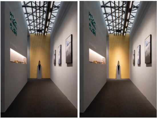光影的整洁感对视觉的影响很大,所以雷士照明在控光这一块做得及其考究,光斑干净、显色性高,才能把光影打得漂亮、干净,使得整个环境的氛围感提升。展厅的长廊里,采用了能够均匀洗亮墙面的磁吸洗墙灯,柔和模式和全亮模式下墙面均匀无暗区,无副光斑。