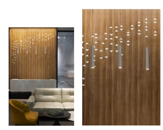 进入到雷士照明展厅,第一眼会被大堂区域的排列组合灯具吸引目光,巧妙提高该区域照度的同时,还避免了因单个灯具瓦数过大而造成不舒适眩光。
