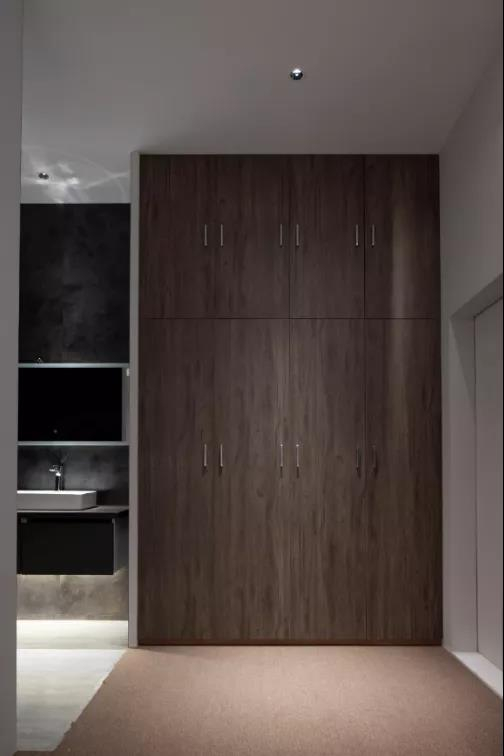 衣柜前的射灯将柜体的材料更有质感,人即使站在衣柜前柜内也可以得到足够的照明,让挑选衣服这件事变得更加简单。