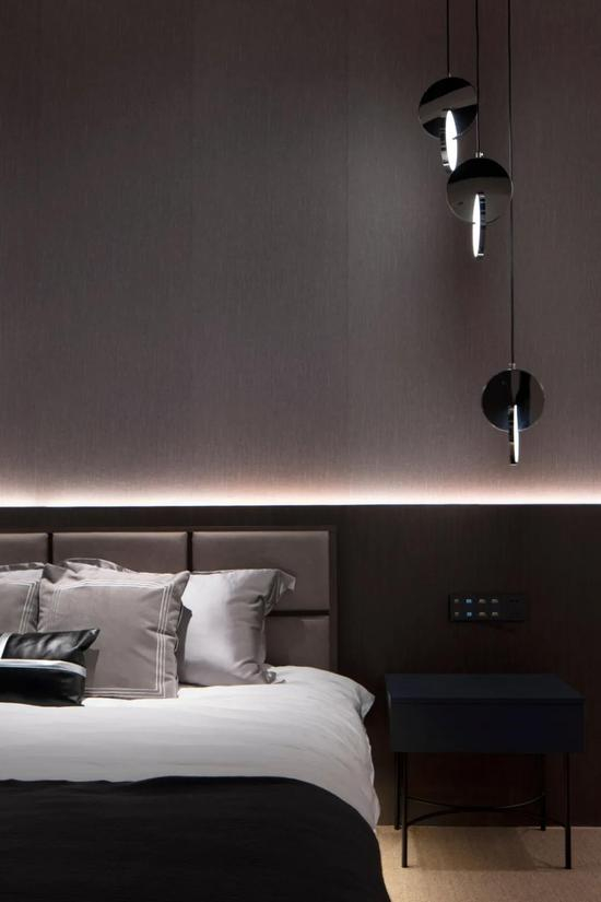 床头背景板的灯带照明也是提升空间氛围的一大利器。